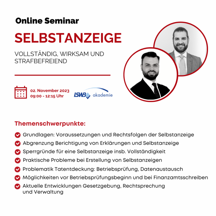 Online-Seminar der LSWB-Akademie: Aktuelles zur Selbstanzeige