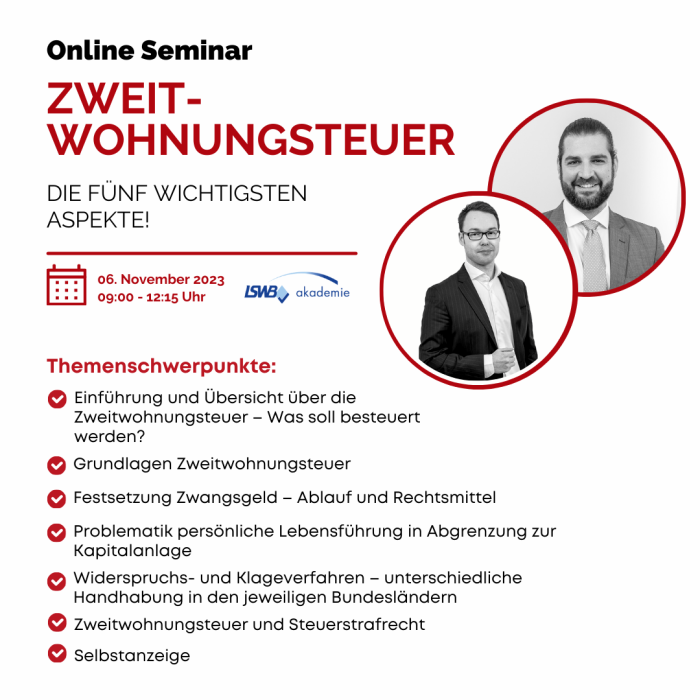 Online-Seminar der LSWB-Akademie: Zweitwohnungsteuer - die fünf wichtigsten Aspekte!
