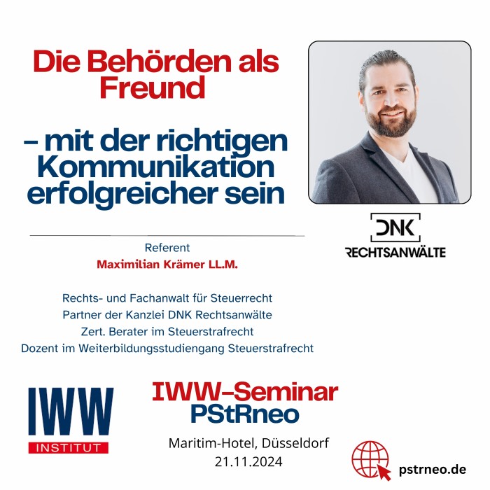 Referenten: Maximilian Krämer LL. M., Rechtsanwalt, Fachanwalt für Steuerrecht und Zert. Berater im Steuerstrafrecht und Esther Seibt-Pfitzner, Rechtsanwältin, Fachanwältin für Steuerrecht, Zert. Beraterin im Steuerstrafrecht